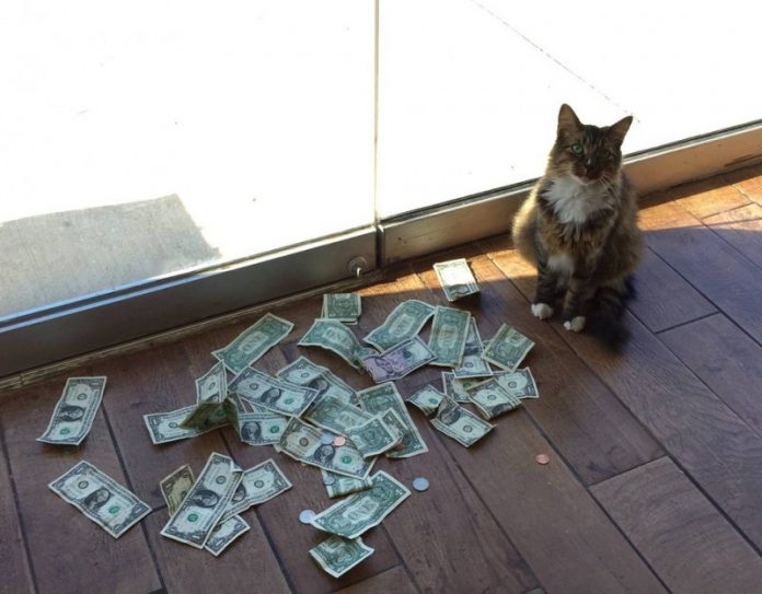 Однажды сотрудники фирмы обнаружили нечто странное. Перед закрытыми стеклянными дверями, ведущими из здания, на полу лежала куча мелких банкнот, а рядом восседал их кот.
