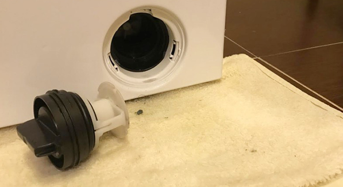 Чтобы почистить фильтр, надо открыть к нему доступ. Обычно он расположен внизу. Перед тем как откручивать крышку, постелите на пол полотенце и подставьте под слив какую-нибудь емкость для воды.
