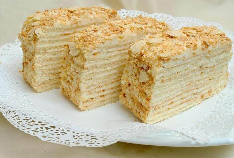 - Из теста испечь 12 очень тонких коржей до золотистого цвета, один самый золотистый измельчить в крошку.