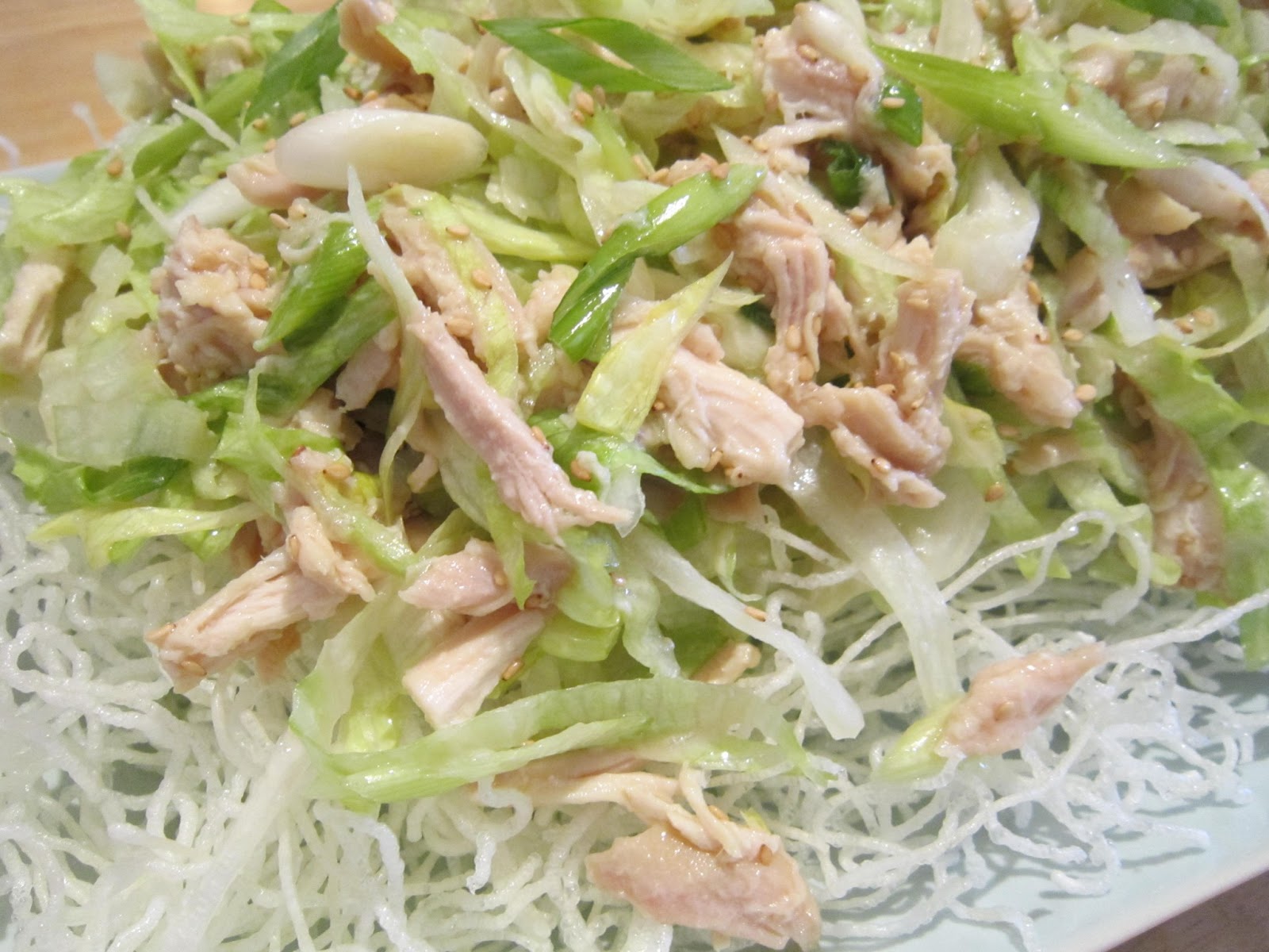 Отварную куриную грудку разобрать на волокна (можно заменить ветчиной). Кальмары отварить 3 минуты, почистить, порезать лапшой. Сыр нарезаем соломкой. Все соединить, посолить-поперчить, заправить майонезом. Продукты брать из расчета примерно 1:1