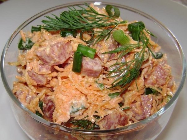 Морковь и сыр натереть на терке. Колбасу нарезать тонкой соломкой. Морковь, сыр, колбасу, кукурузу, чеснок заправить майонезом и перемешать. Добавить соль и перец и снова перемешать. Украсить зеленью!